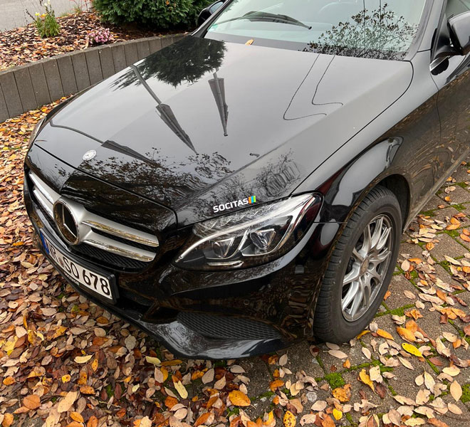 Unauffällig, aber dennoch präsent möchten wir den SOCITAS Fuhrpark branden. Vorne links über dem Scheinwerfer platziert zieht der Aufkleber trotz seiner eher geringen Größe genügend Aufmerksamkeit auf sich.